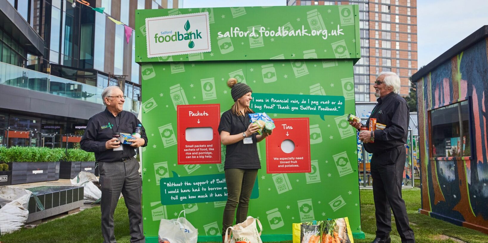 MediaCityUK based Carbon Creative has transformed a deluxe shed at the popular ‘Box on the Docks’ open-air gallery and immersive art trail into a striking Salford Foodbank Giftbox collection point. Visitors to the trail and passers-by are being asked to drop-in an item such instant coffee, boil in a bag rice and pasta, jars of jam and sauces, seasonal chocolate boxes and toilet roll.