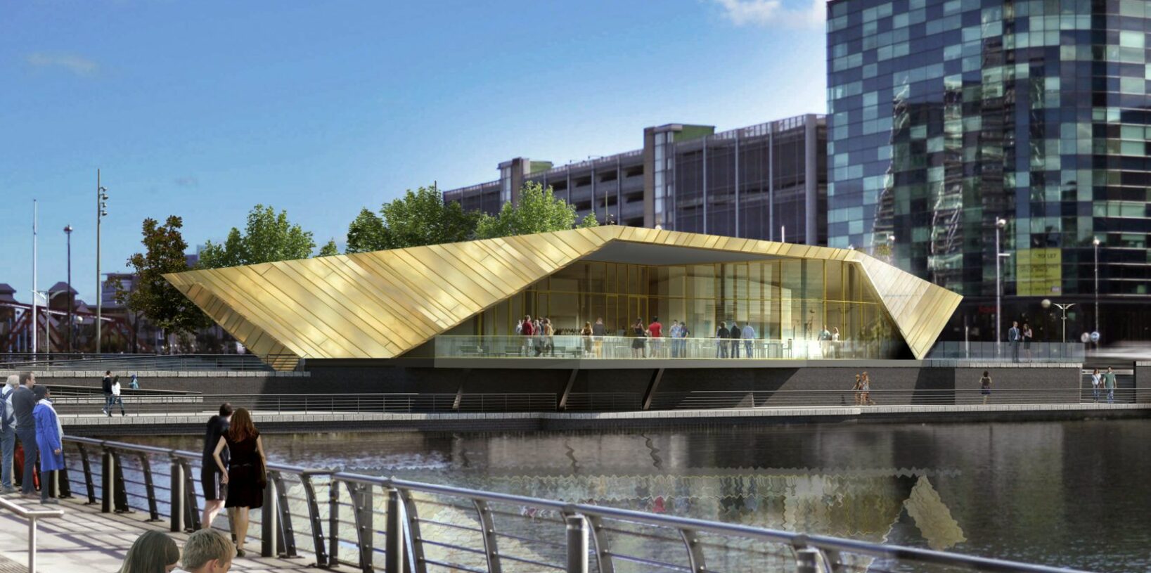 The futuristic building will feature a gold-clad roof and walls externally, while a terrace will cantilever out over the canal, creating a trendy waterside al fresco drinks and dining space.